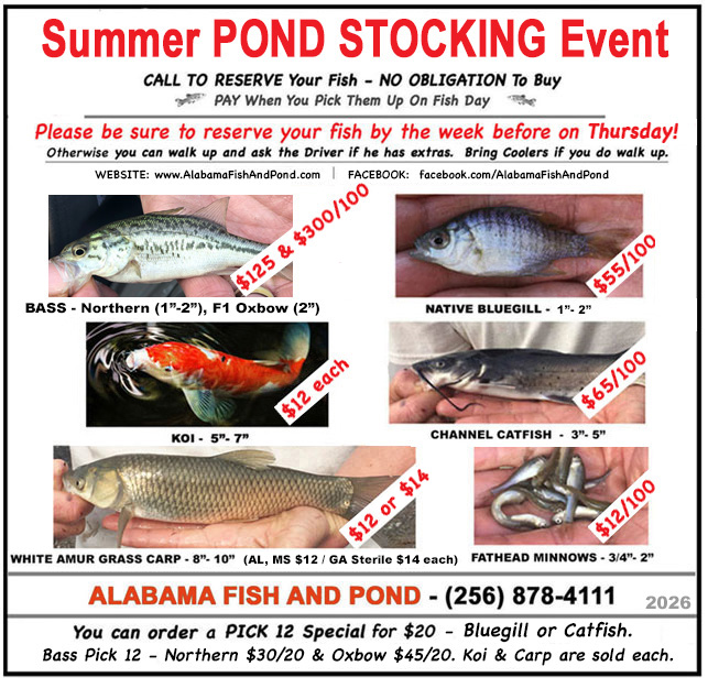 For SUMMER Pond Stocking Events across AL, MS & GA