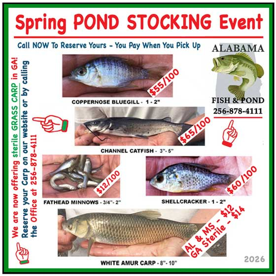 For SPRING Pond Stocking Events across AL, MS & GA